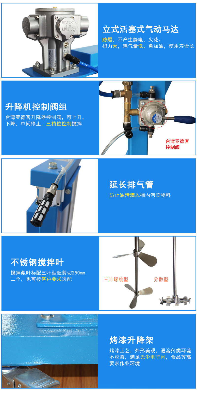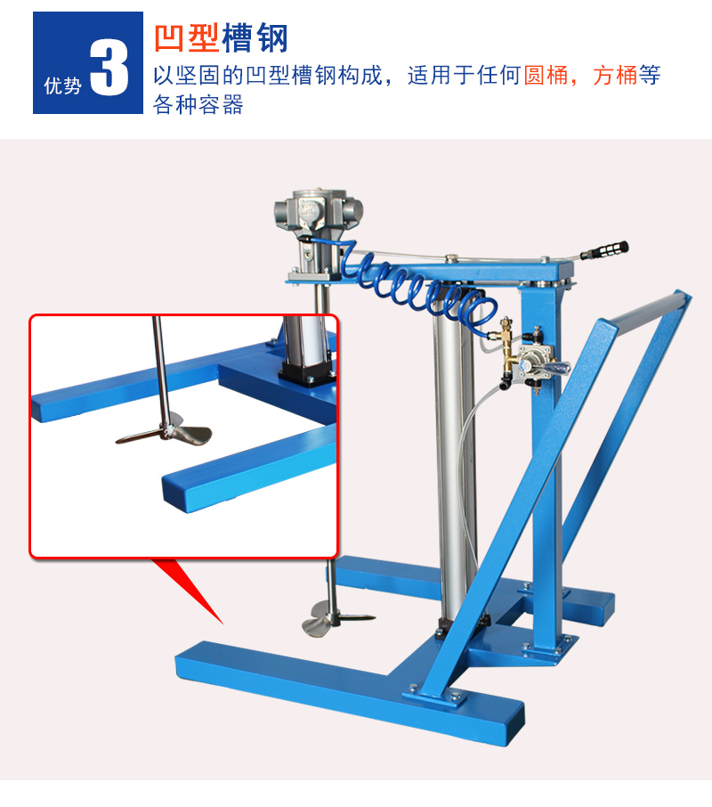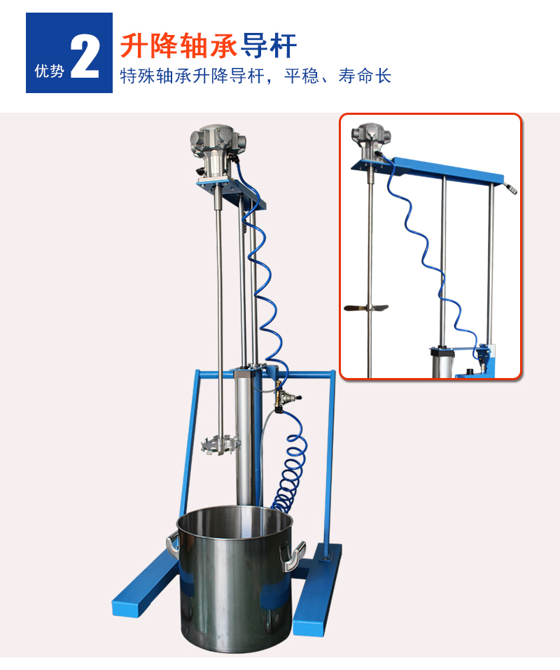 1)搅拌容量:适合于20L-100L开口桶,气动升降方式。